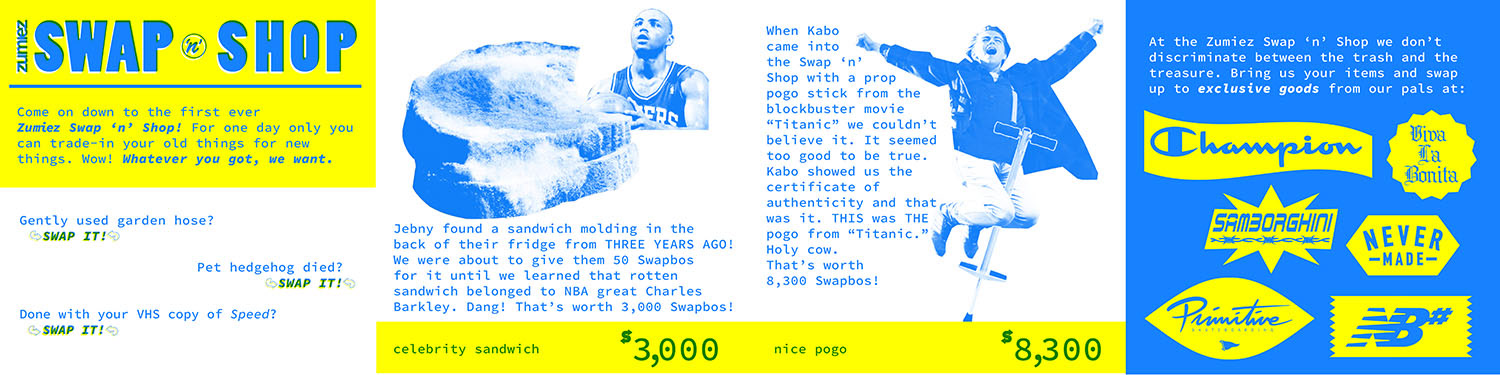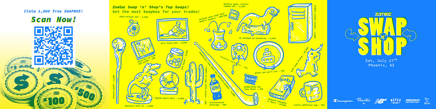 The Zumiez Swap 'n' Shop is a new, yet familiar, retail experience. You bring in your used things and swap up to new better things. Of course its not really about the dollar value of your item as much as the pitch and backstory you have along with it. The first Swap 'n' Shop experience took place in Phoenix, AZ in 2019. As creative lead on this project I was responsible for branding, creative assets, and developing the actual experience. I even got to do some voice-over work for a radio ad.